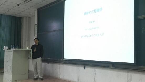12月5日下午,北京大学数学科学学院周蜀林教授做客“两校名师讲堂”,在综合楼112作了题为“偏微分方程随想”的精彩报告。报告由副院长吕文主持,200余名师生聆听了报告。