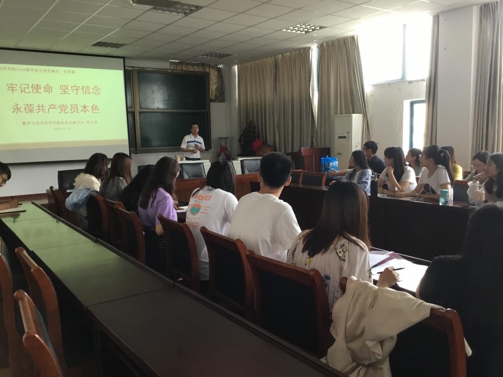 下午4:00,pa电子官方网站党总支副书记邱文伟以“牢记使命,坚守信念,永葆共产党员本色”为主题,给2019届26名毕业生党员上了最后一次党课。课上,邱文伟带领毕业生党员们一起学习了习近平总书记在纪念五四运动100周年大会上的讲话,并向毕业生党员们提出了五点希望和要求:一是不忘初心、二是坚持理想、三是不断学习,四是勇创佳绩、五是守牢底线。他告诫毕业生党员们要严守党的政治纪律和政治规矩,切实用党纪党规规范自己的言行,切实维护好党的形象,无论以后身处什么位置,都要永葆共产党员清正廉洁本色。