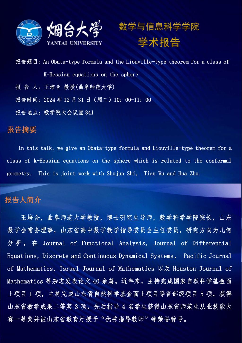 学术报告--王培合 教授(曲阜师范大学)—20241231